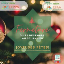 FERMETURE CFPPA et CFAA FORMA’TERRA : du 22 décembre au 05 janvier 2026 JOYEUSES FÊTES ! Le CFAA FORMA’TERRA et le CFPPA FORMA’TERRA seront fermés : du lundi 22 décembre[…]
