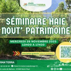 PARTICIPEZ au SÉMINAIRE HAIE, NOUT’ PATRIMOINE : 26 novembre 2025 à FORMA’TERRA SÉMINAIRE HAIE, NOUT’ PATRIMOINE — le mercredi 26 novembre 2025 (13h00 à 17h30) à FORMA’TERRA (165 route[…]